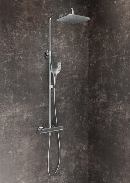 A zuhanyoszlopot a zuhanykabin falára szerelik. Magasságát a rögzítő anya segítségével lehet beállítani - egyszerűen kézzel, bármikor a felszerelés után. A kapcsolóval váltani lehet a fej- és kézi zuhany között, vagy középső pozícióba állítható.