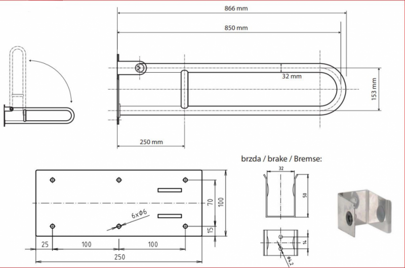 BEMETA HELP Felhajtható kapaszkodó, U-típus, 850mm, matt