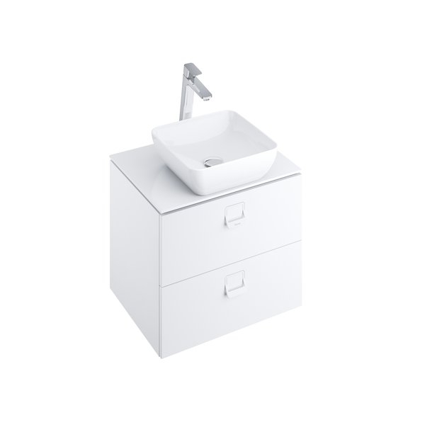 A Comfort 600 vízálló lakkozott lapot mély impregnálással kínáljuk fényes fehér színben. A SD Comfort 60 / SD Comfort II 60 fali szekrényre rögzíthető. A mosdókagyló vagy a térben álló csaptelep számára nincs előfúrva lyuk. A lap és a szekrény kombinációjával nagy tároló- és lerakóhely jön létre.