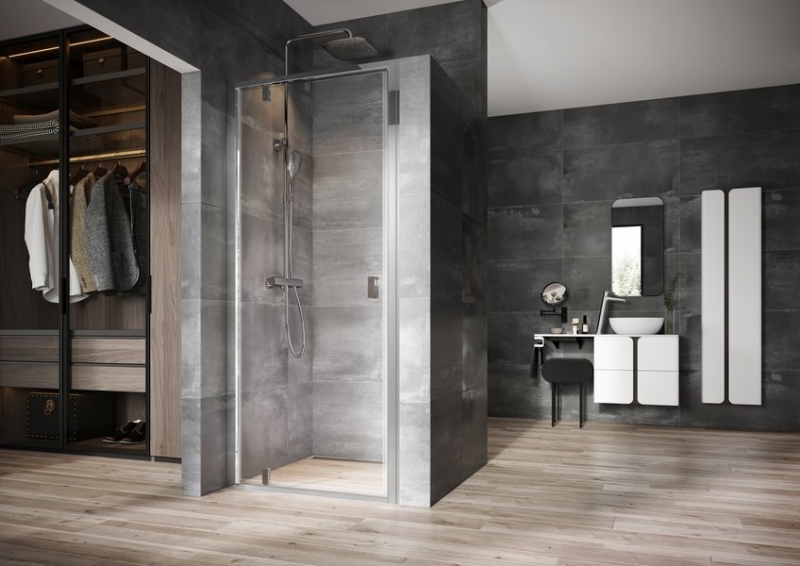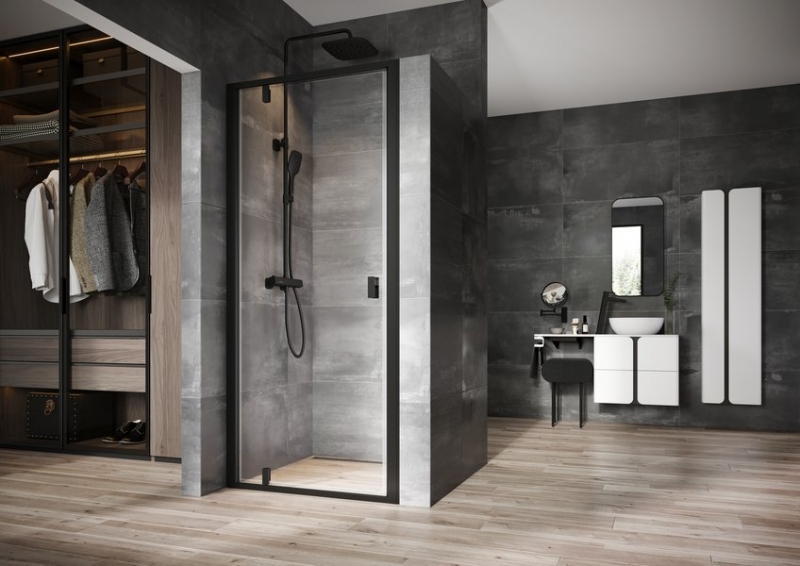 Egyrészes Nexty zuhanyajtó fekete kerettel, fogantyúval és zsanérral. A betétlemez Ravak AntiCalc® vízlepergető réteggel ellátott, átlátszó biztonsági üvegből készült. Pivot forgózsanéros nyílórendszer. Forgatható termék, bal és jobb oldali kivitel kialakításához.