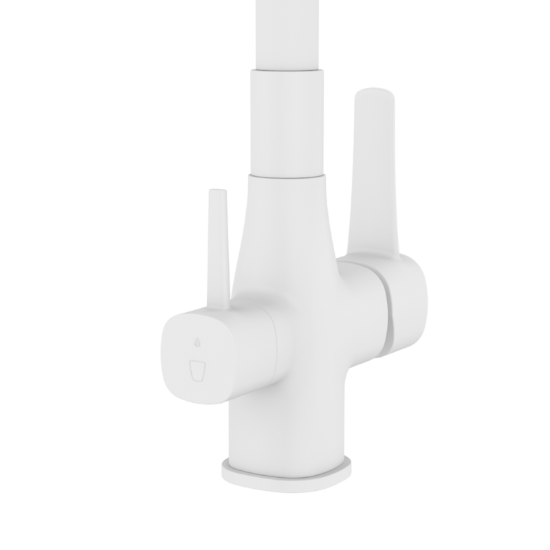 A csaptelep két különálló fogantyúval van felszerelve – az egyik a normál vízhez, a másik a szűrt vízhez –, ami kíméli a szűrőt és maximális kényelmet biztosít a mindennapi használat során. A rugalmas kifolyó növeli a mosogatóban való munkavégzés kényelmét és a hozzáférhetőséget.
