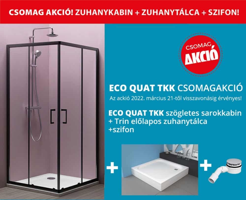 Eco Quat TKK szögletes sarokkabin fekete profillal + Trin előlapos zuhanytálca + szifon