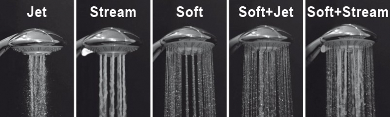A Jet funkcióval erős vízsugarat érhet el a rózsa közepéből, amely intenzíven átjárja a bőrét. Alkalmas a fürdőszobában nehezen hozzáférhető helyek tisztítására is. A Stream funkció serkentő masszázst biztosít a tíz középső fúvókának köszönhetően. A harmadik funkció, a Soft, finom, nyugtató vízsugarat kínál kellemes relaxációhoz. A további funkciók finom sugarakat kombinálnak erősebbel.