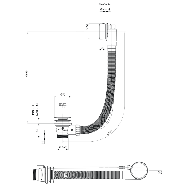 POLYSAN kád le- és túlfolyó, bovdenes, 800mm, átm.:72mm, króm