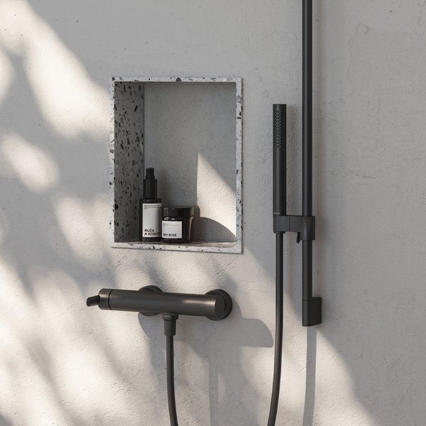 Puri falra szerelhető zuhanycsaptelep, zuhanykészlet nélkül. Fekete kivitelben. CoolFeel funkcióval, amely megakadályozza a csaptelep felületének túlzott felmelegedését.