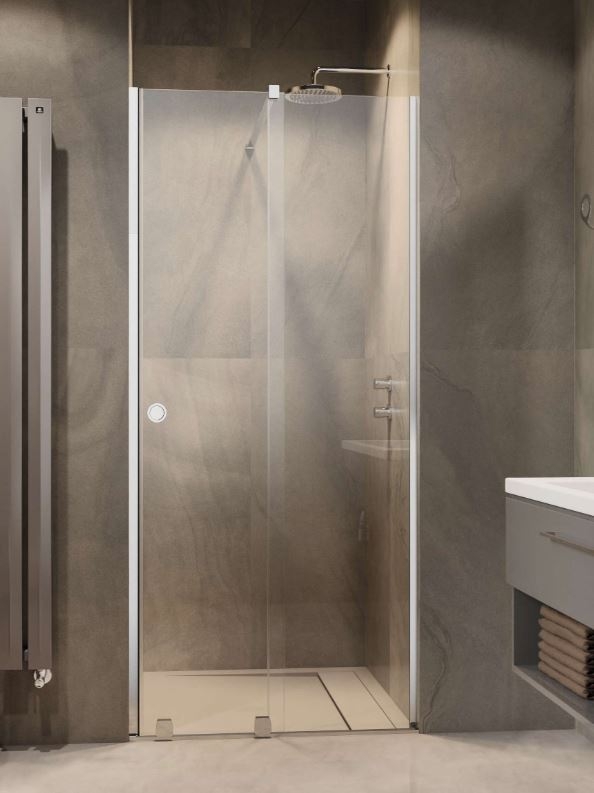 Alsógörgős zuhanyajtó kerek fogantyúval és egy fix résszel, 90-100-as méretben.