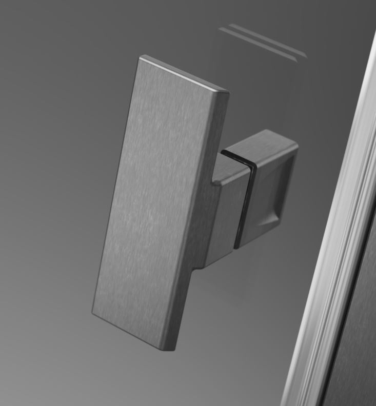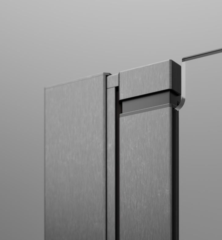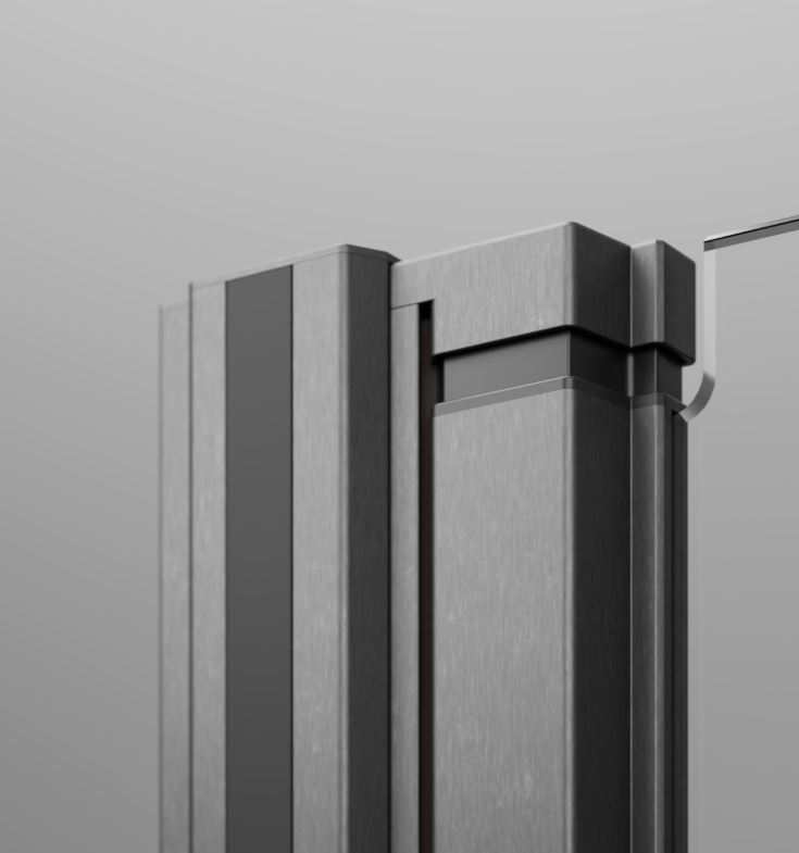 Lengőajtós kivitelű szálcsiszolt fegyvermetál zuhanyajtó maximális belépőszélességgel.