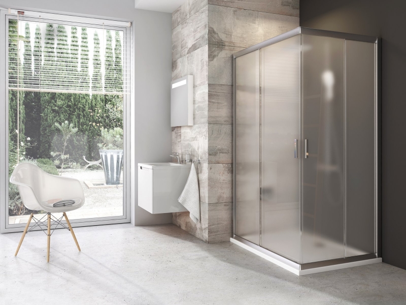 Blix sarok zuhanykabin, szatén kerettel, Grape edzett biztonsági üveggel és Ravak AntiCalc® vízlepergető réteggel. Tolóajtós rendszer. A termék két zuhany ajtóból áll.