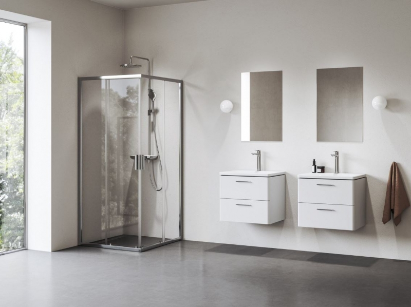 Blix II sarokzuhanykabin króm kivitelben, átlátszó, edzett biztonsági üveggel és Ravak AntiCalc® vízlepergető réteggel. Tolóajtós rendszer. A termék egy zuhanyajtóból és egy fix falból áll. Forgatható termék bal és jobb oldali változat kialakításához.
