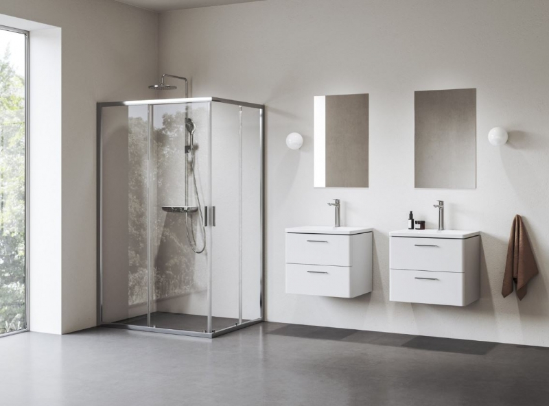 A zuhanykabin két zuhanyajtóból áll (NBLRV2K 80 + NBLRV2K 90). A terméket a burkolt fürdőszoba sarkába telepítheti zuhanyfolyókával vagy padlóösszefolyóval közvetlenül a padlóra.
