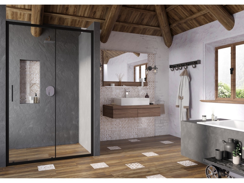 Blix Slim kétrészes zuhanyajtó fekete kivitelben, átlátszó biztonsági üveggel és Ravak AntiCalc® vízlepergető réteggel. Tolóajtós rendszer. Forgatható termék bal és jobb oldali változat kialakításához.