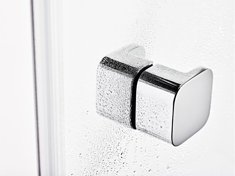 Sarok zuhanykabin krómozott fém részekkel és átlátszó biztonsági üveggel, Ravak Anticalc® védőréteggel. Nyílóajtós rendszer. A termék egy zuhanyajtóból és egy fix falból áll.