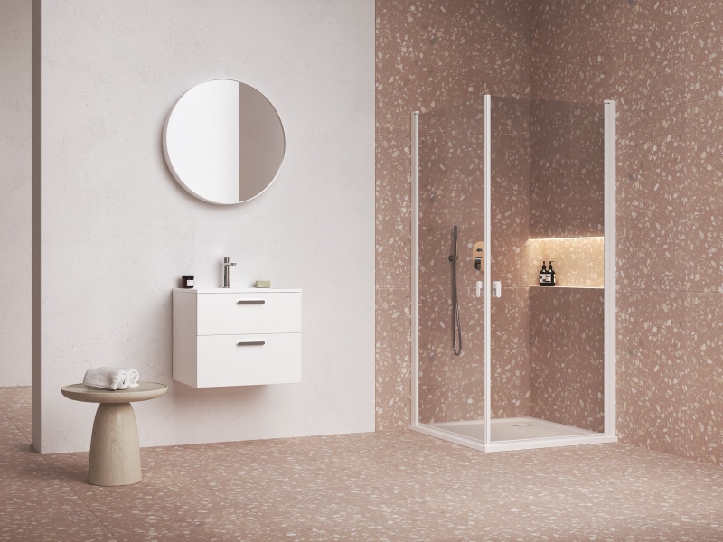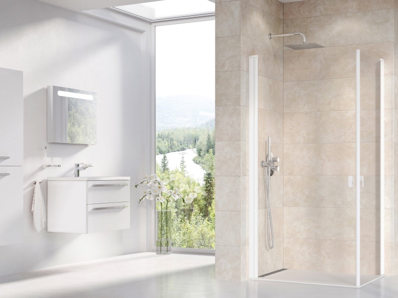 Chrome sarok zuhanykabin, matt fehér kerettel, átlátszó biztonsági üveggel, Ravak antialc® vízlepergető réteggel. A kabin két zuhanyajtóból áll. Nyílóajtós rendszer.