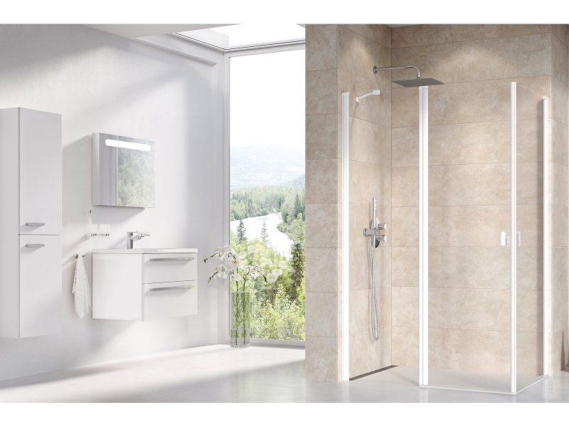 Chrome sarok zuhanykabin, matt fehér kerettel és átlátszó biztonsági üveggel, Ravak antialc® vízlepergető réteggel. A termék egy egyrészes zuhanyajtóból és egy kétrészes zuhanyajtóból áll. Nyílóajtós rendszer. Forgatható termék, jobb és bal oldali kivitel is kialakítható.