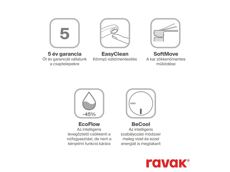 A design harmonizálása érdekében javasoljuk a Chrome II csaptelepeket a koncepció további elemeivel vagy más Ravak termékekkel kombinálni. Tisztításukra a Ravak Cleaner Chrome használatát ajánljuk.