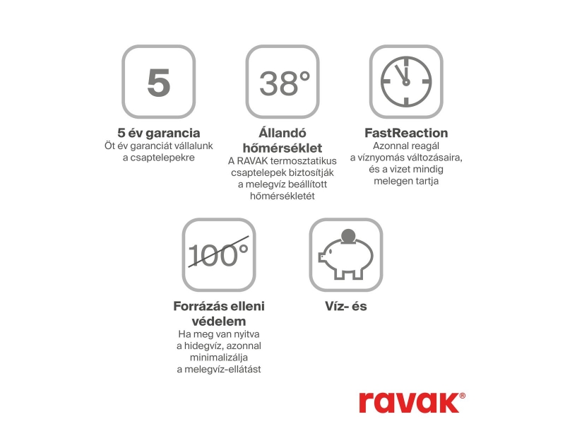 A design harmonizálása érdekében javasoljuk a Chrome II csaptelepeket a koncepció további elemeivel vagy más Ravak termékekkel kombinálni. Tisztításukra a Ravak Cleaner Chrome használatát ajánljuk. Az R-box Multi RB 071.50 falsík alatti alaptestneknek nem része a csaptelep teste, azt külön meg kell vásárolni. Az R-box Multi tartalmazza a falhoz rögzítéshez szükséges alkatrészeket, de nem tartalmazza a vízbekötéshez szükséges anyagokat. Az R-box Multi tartozéka egy műanyag takaróelem, mely lehetővé teszi, hogy a csaptelep leszerelése után, vagy felszerelése előtt teljesen működő vízhálózat legyen az épületben. Ezzel a műanyag takaróelemmel lehetséges a vízrendszer légtelenítése anélkül, hogy elzárnánk a vizet. Az R-box Multin van egy felfelé mutató nyíl, ami az egyértelmű elhelyezést segíti.
