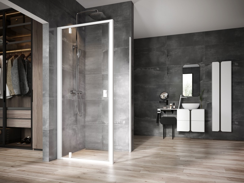Nexty sarokzuhanykabin fehér kerettel, fogantyúkkal és zsanérokkal. A betétlemez Ravak AntiCalc® vízlepergető réteggel ellátott, átlátszó biztonsági üvegből készült. Pivot forgózsanéros rendszer. A termék egy zuhanyajtóból és egy fix falból áll. Forgatható termék bal és jobb oldali kivitel kialakításához.