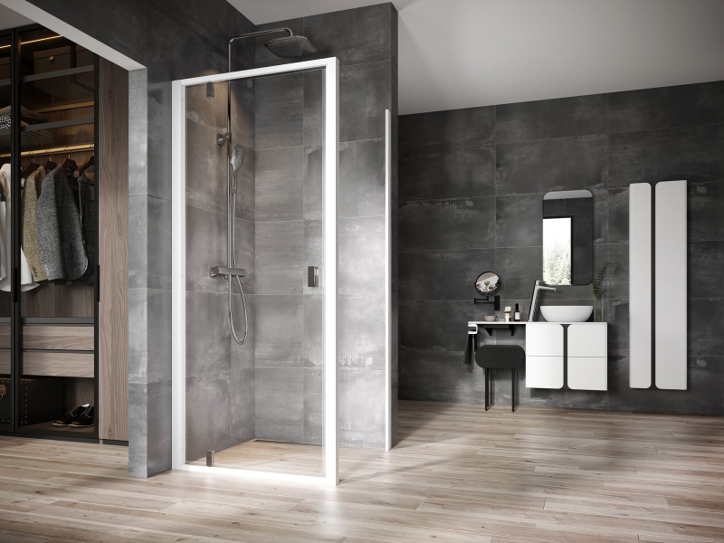 Nexty sarokzuhanykabin fehér kerettel, krómozott fogantyúkkal és zsanérokkal. A betétlemez Ravak AntiCalc® vízlepergető réteggel ellátott, átlátszó biztonsági üvegből készült. Pivot forgózsanéros rendszer. A termék egy zuhanyajtóból és egy fix falból áll. Forgatható termék bal és jobb oldali kivitel kialakításához.