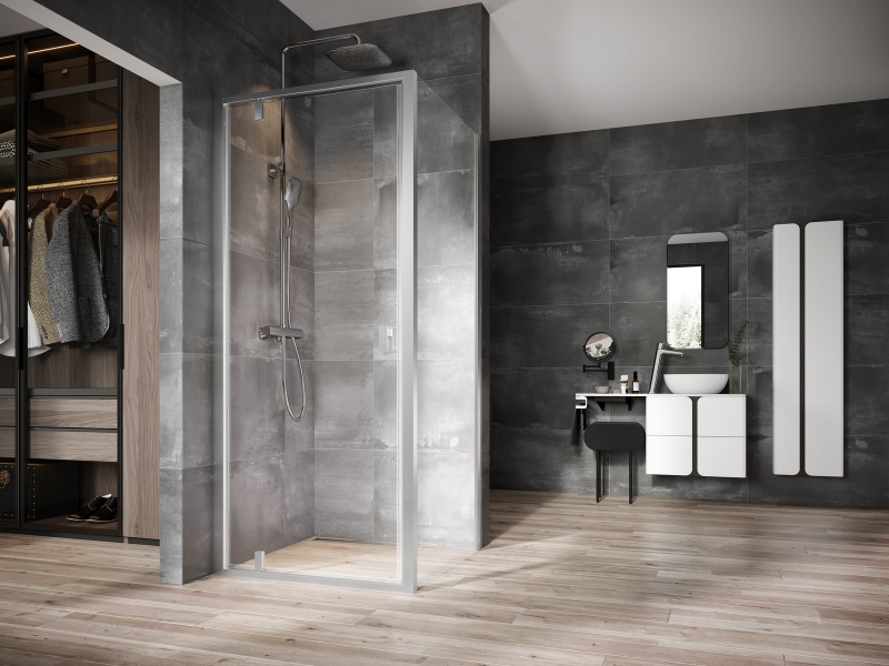 Nexty sarokzuhanykabin szatén kerettel, fogantyúkkal és zsanérokkal. A betétlemez Ravak AntiCalc® vízlepergető réteggel ellátott, átlátszó biztonsági üvegből készült. Pivot forgózsanéros rendszer. A termék egy zuhanyajtóból és egy fix falból áll. Forgatható termék bal és jobb oldali kivitel kialakításához.