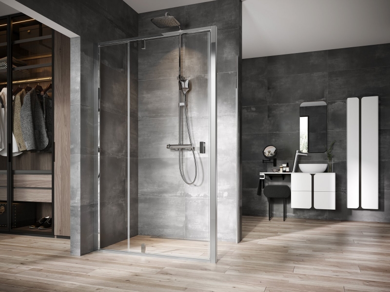 Nexty sarokzuhanykabin krómhatású kerettel, krómozott fogantyúkkal és zsanérokkal. A betétlemez Ravak AntiCalc® vízlepergető réteggel ellátott, átlátszó biztonsági üvegből készült. Pivot forgózsanéros rendszer. A termék egy zuhanyajtóból és egy fix falból áll. Forgatható termék bal és jobb oldali kivitel kialakításához.