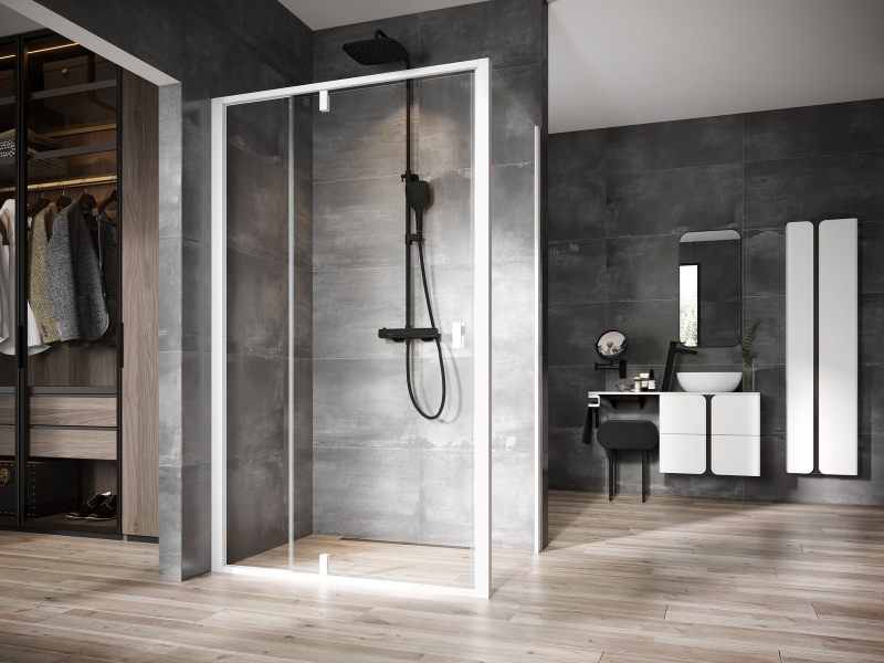 Nexty sarokzuhanykabin matt fehér kerettel, fogantyúkkal és zsanérokkal. A betétlemez Ravak AntiCalc® vízlepergető réteggel ellátott, átlátszó biztonsági üvegből készült. Pivot forgózsanéros rendszer. A termék egy zuhanyajtóból és egy fix falból áll. Forgatható termék bal és jobb oldali kivitel kialakításához.