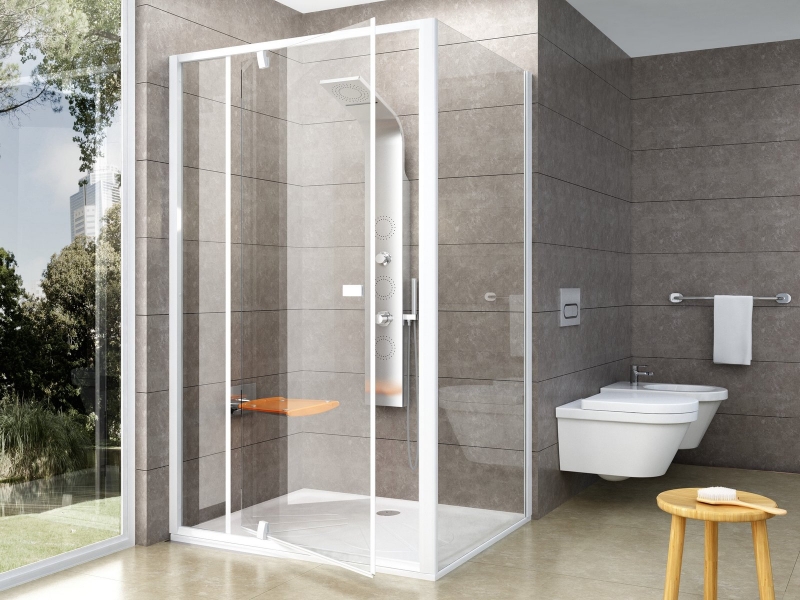 Pivot sarokzuhanykabin fehér kerettel, fogantyúkkal és zsanérokkal. A betétlemez Ravak AntiCalc® vízlepergető réteggel ellátott, átlátszó biztonsági üvegből készült. Pivot forgózsanéros rendszer. A termék egy zuhanyajtóból és egy fix falból áll. Forgatható termék bal és jobb oldali kivitel kialakításához.