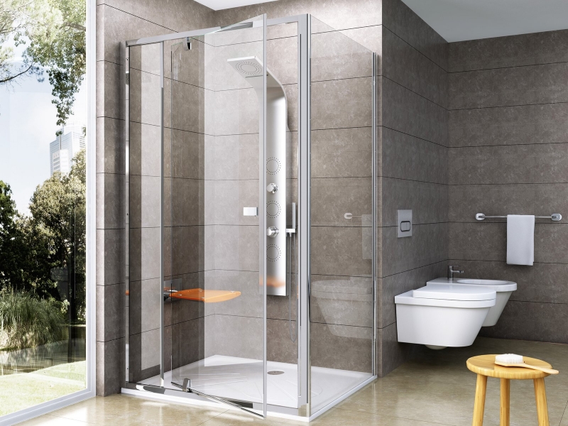 Pivot sarokzuhanykabin szatén kerettel, fogantyúkkal és zsanérokkal. A betétlemez Ravak AntiCalc® vízlepergető réteggel ellátott, átlátszó biztonsági üvegből készült. Pivot forgózsanéros rendszer. A termék egy zuhanyajtóból és egy fix falból áll. Forgatható termék bal és jobb oldali kivitel kialakításához.