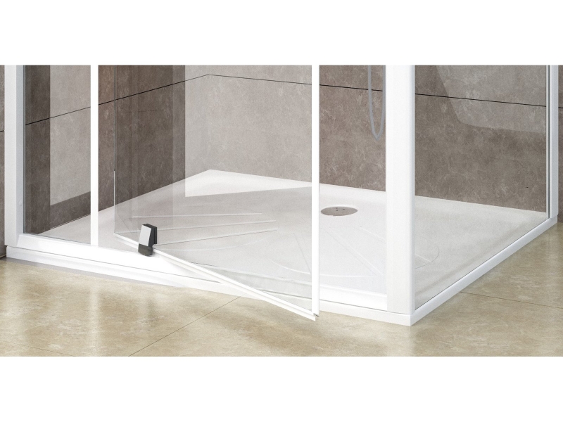 Három oldalú zuhanykabin, fehér kerettel, krómozott fogantyúkkal és zsanérokkal. Átlátszó, edzett biztonsági üvegből készült, Ravak AntiCalc® vízlepergető réteggel ellátva. Pivot, forgózsanéros nyílórendszer. A termék zuhanyajtóból és két fix falból áll. Forgatható termék bal és jobb oldali kivitel kialakításához.