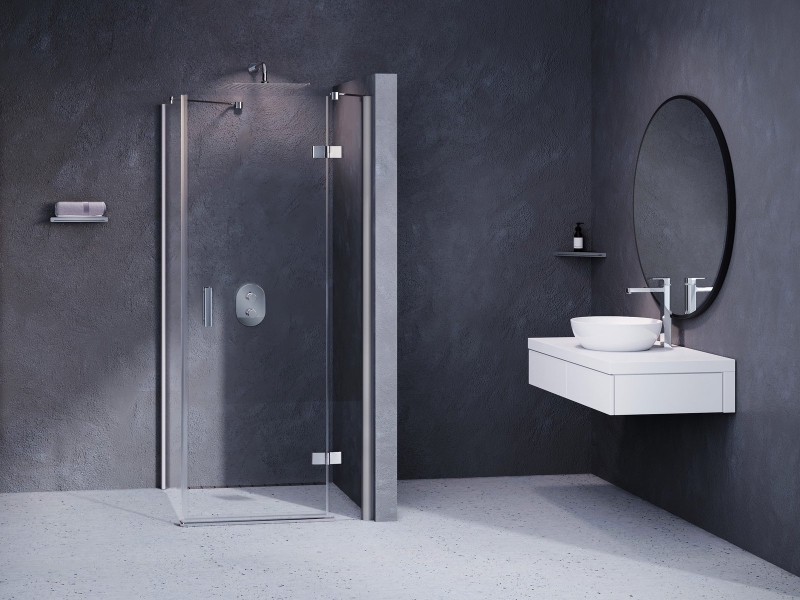 SmartLine sarokzuhanykabin fényes króm kivitelben, átlátszó biztonsági üveggel és Ravak AntiCalc® védőbevonattal. Zsanéros nyíló rendszer. A termék egy zuhanyajtóból és egy fix falból áll.