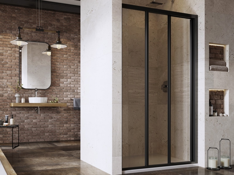 Supernova háromrészes zuhanyajtó, fekete színben, transparent üveg betétlemezzel. A termék 180°-os megfordításával választhatunk a balos vagy jobbos változat között.