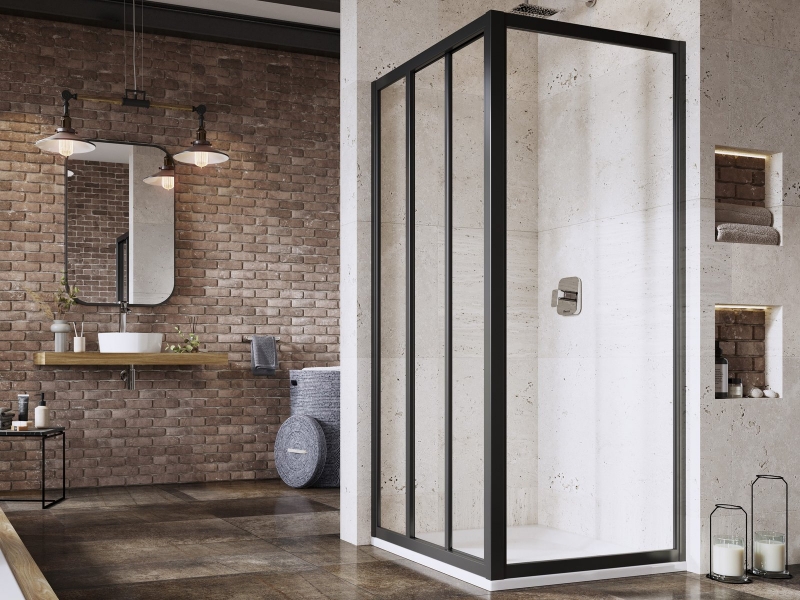 Supernova háromrészes zuhanyajtó fix fallal, fekete színben, transparent üveg betétlemezzel.