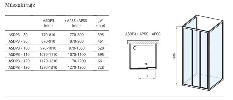 A három falú "U" alakú zuhany három különálló termékből, egy tolózuhanyajtóból (ASDP3) és két rögzített fix oldalfalból (APSS) áll. A terméket 180°-kal elfordítva bal vagy jobb ajtónyitási lehetőséget kap. Ravak Angela, Perseus Pro, Perseus Pro Flat, Perseus Pro Chrome zuhanytálcákra fürdőszoba csempézett sarkába vagy közvetlenül a padlóra szerelhető beépített zuhanyfolyókával vagy padlólefolyóval. Az ANPS beállítóprofil használatával a termékek 20 mm-rel meghosszabbíthatók, így tökéletesen alkalmazkodnak oldalanként akár 4 cm-es építési egyenetlenségekhez is.