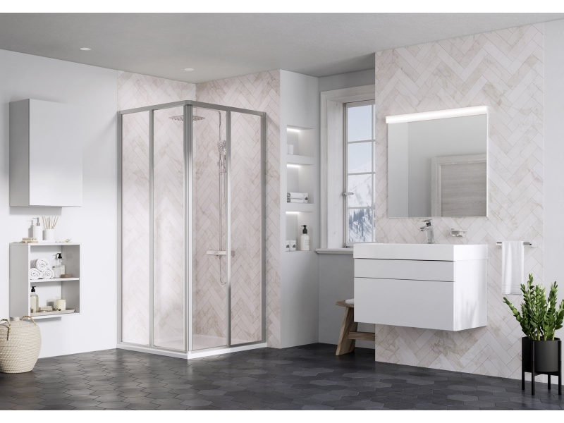 Supernova sarok zuhanykabin. Az üveget Ravak AntiCalc® védőréteg védi. Tolóajtós nyitórendszer. A termék két zuhanyajtóból áll.