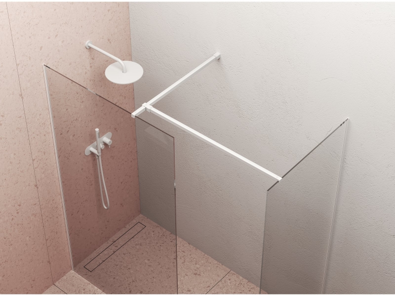 Walk-In Double Wall sarok zuhanykabin egyoldali nyitott belépéssel. Matt fehér kivitelben, transparent üveggel, Ravak AntiCalc® védőréteggel ellátva. A termék két fix falból és fém alkatrészekből áll.