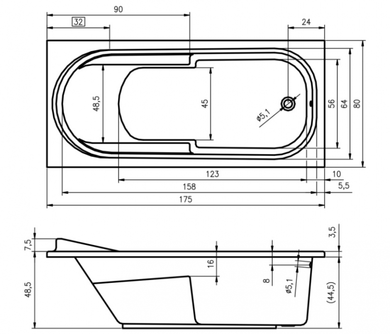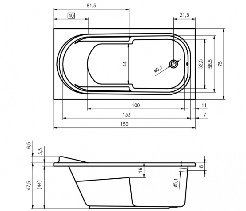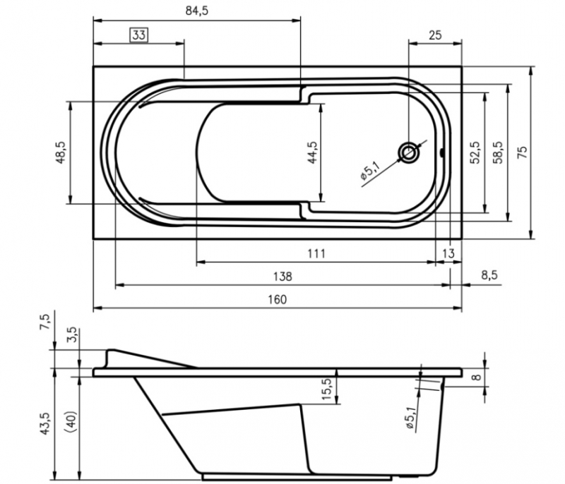 A kád egyenes, beépíthető kivitelű, karfával és a lábvégen elhelyezett vízelvezetéssel, ami kényelmes testhelyzetet és praktikus használatot biztosít. A kád 160x75 méretben kiváló választás, ha tágas belső teret szeretne viszonylag kis alapterületen, míg a kisebb és nagyobb méretek más igényekhez igazodnak.