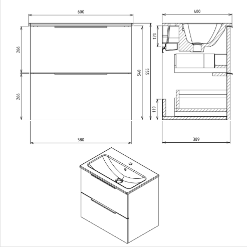 Sapho Cirasa Mosdótartó szekrény, 2 fiókkal, 58 x 54 x 39 cm, Siena Strip