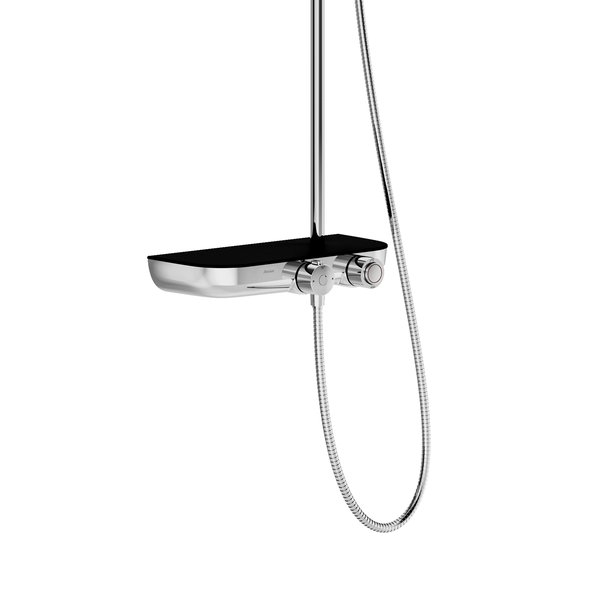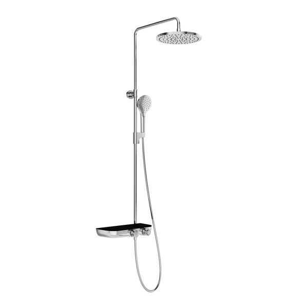 Termo zuhanyoszlop stop funkcióval, zuhanykészlettel. Fényes króm kivitelben, fekete polccal. Állandó vízhőmérséklet beállítása.
