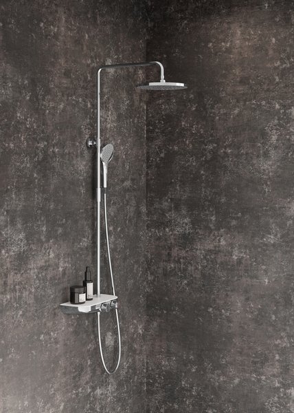 A kézi zuhany tartóját egy kézzel bármilyen pozícióba mozgathatja és beállíthatja a dőlésszögét is. A csaptest felületén praktikus polc található, fehér vagy fekete kivitelben, amely könnyen karbantartható és elegendő tárolóhelyet biztosít.