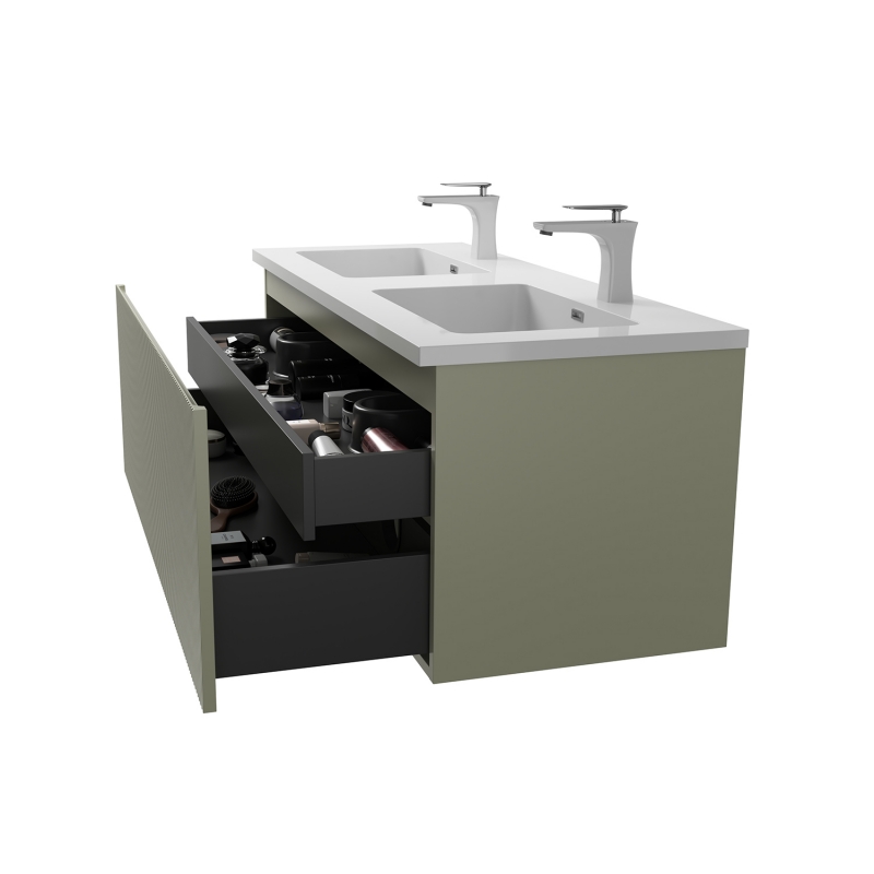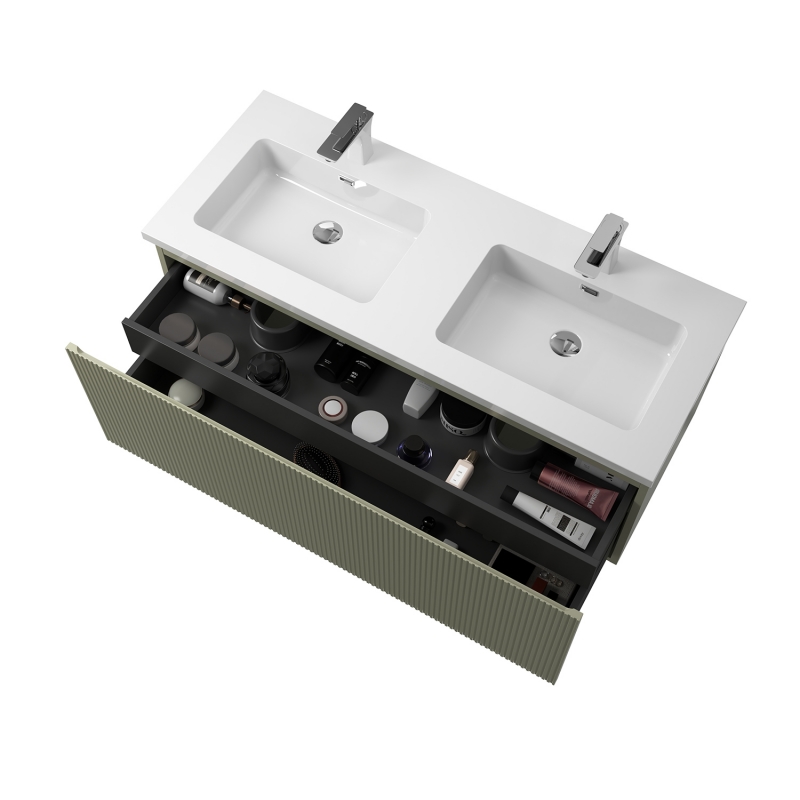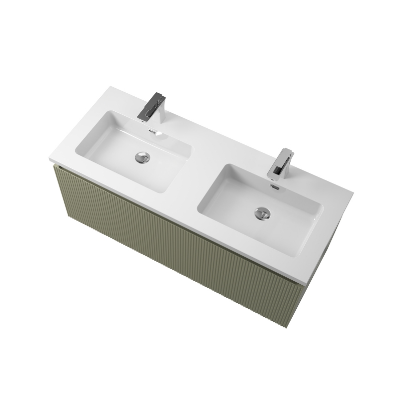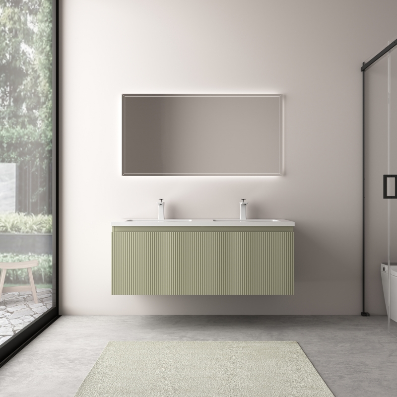 1 fiókos mosdószekrény, halvány bambuszzöld lakkozott felülettel, függőlegesen bordázott előlappal