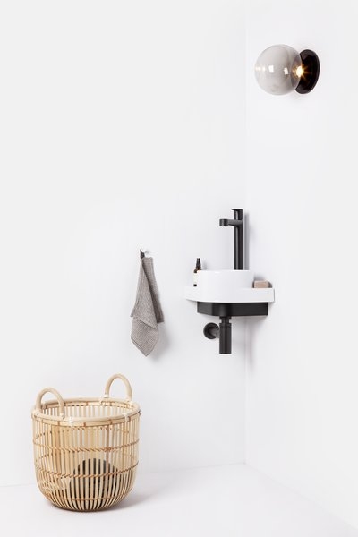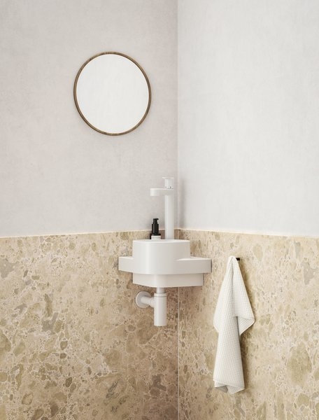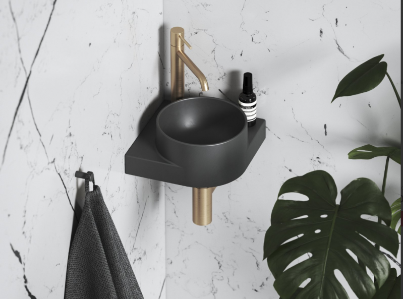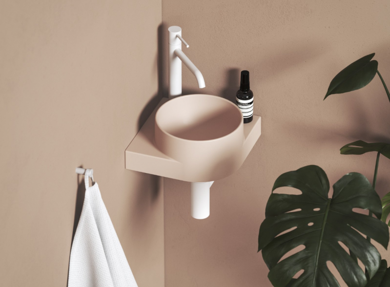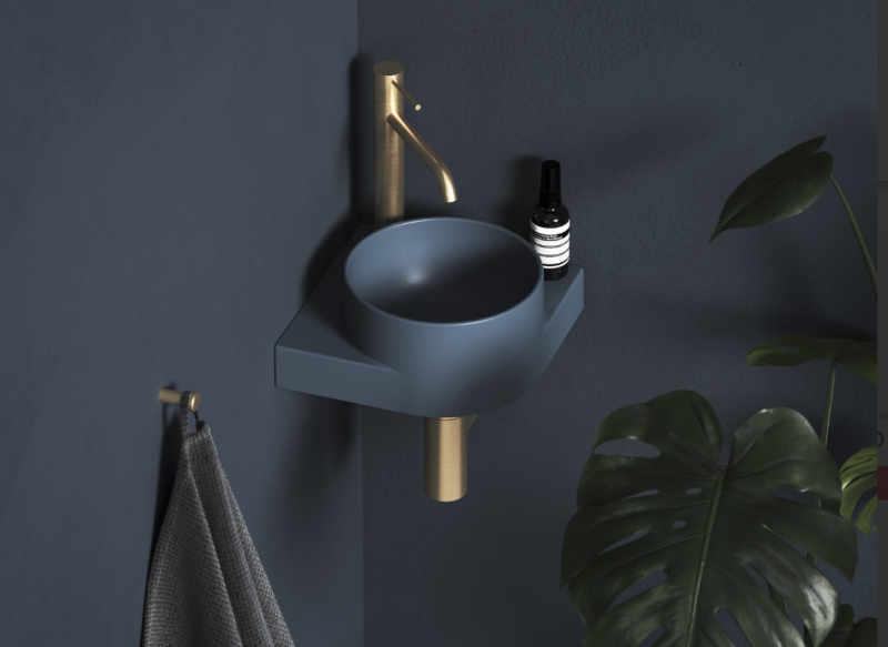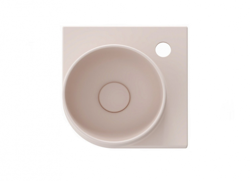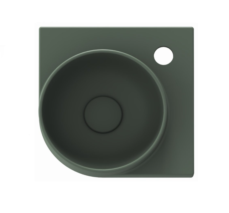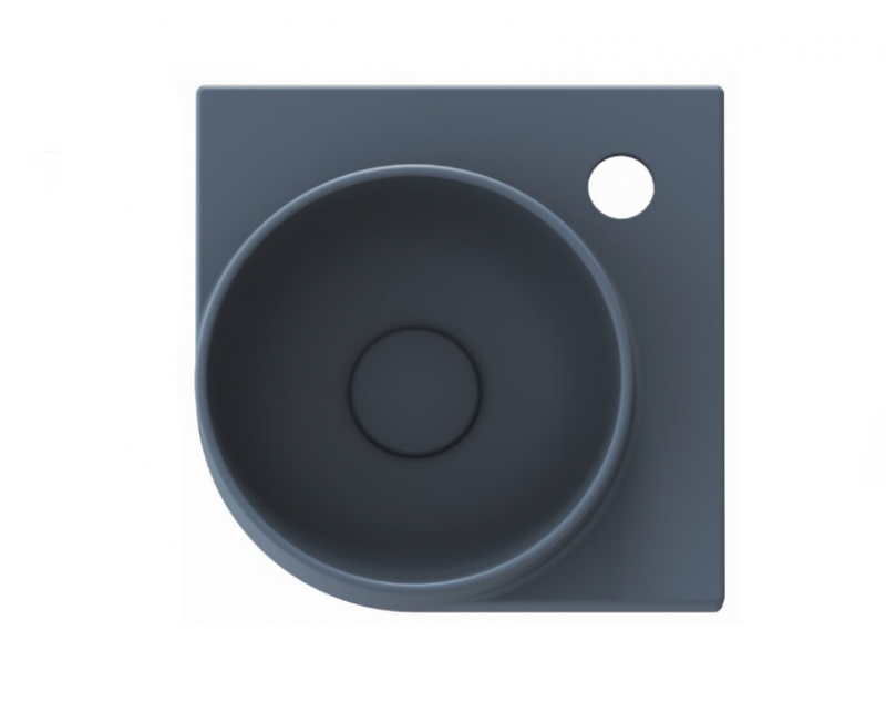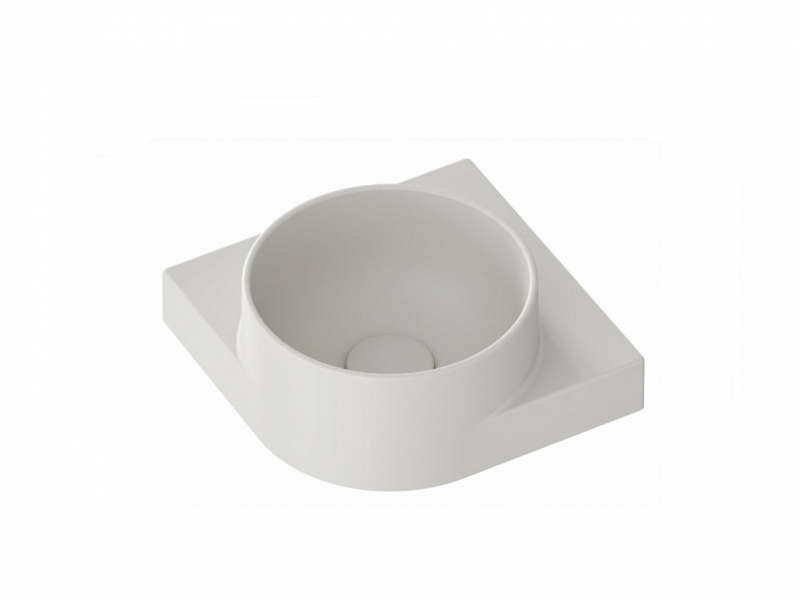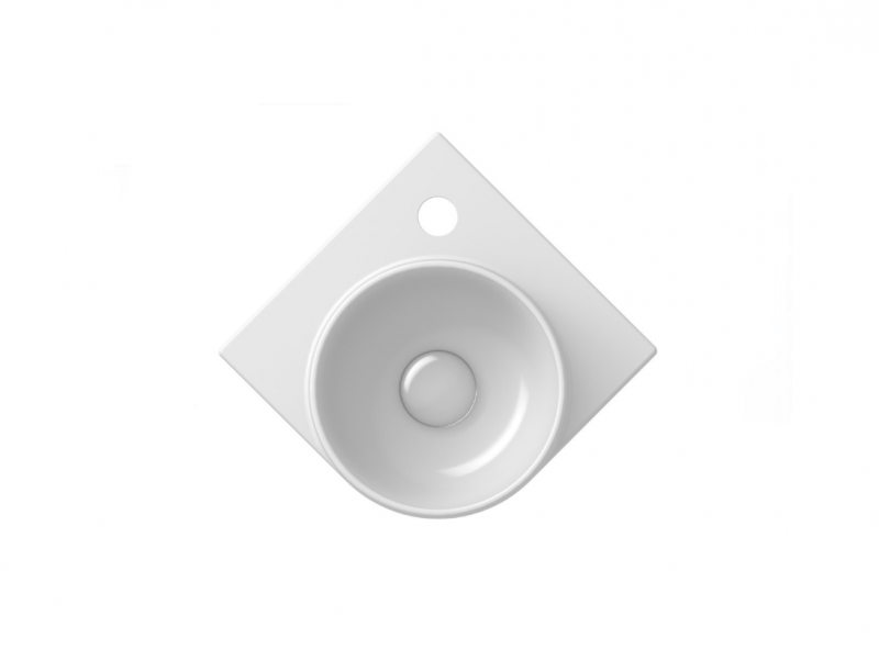 Vékony falú kerámia Yard sarokmosdó a Yard konzolra történő felszereléshez, túlfolyó nélkül. Fehér kivitel. Álló csaptelep furattal.