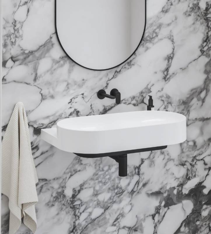 A Yard 80 mosdó minőségi kerámiából készül. A Yard 80 konzolra vagy a CS Yard 80 mosdó alatti szerkezetre szerelhető, amely nyitott polcos bútordarabként szolgál. A mosdót önmagában nem lehet a falra függeszteni. A mosdót fix mosdó szifonnal kell kombinálni, amely megakadályozza a víz túlfolyását.
