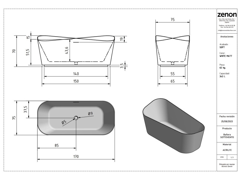 • A Sottovento Negro/Blanco Mate szabadonálló kád gyártása modern technológiával történik: prémium minőségű akril vagy akril-ABS lemezt használnak, amit először felmelegítenek, majd vákuummal formáznak a kád végleges alakjára. Ezután a kád alját műgyantás üvegszálas réteggel erősítik meg, ami tartósabbá és stabilabbá teszi a Sottovento Negro/Blanco Mate szabadonálló kádat, így hosszú évekig megbízhatóan szolgál.